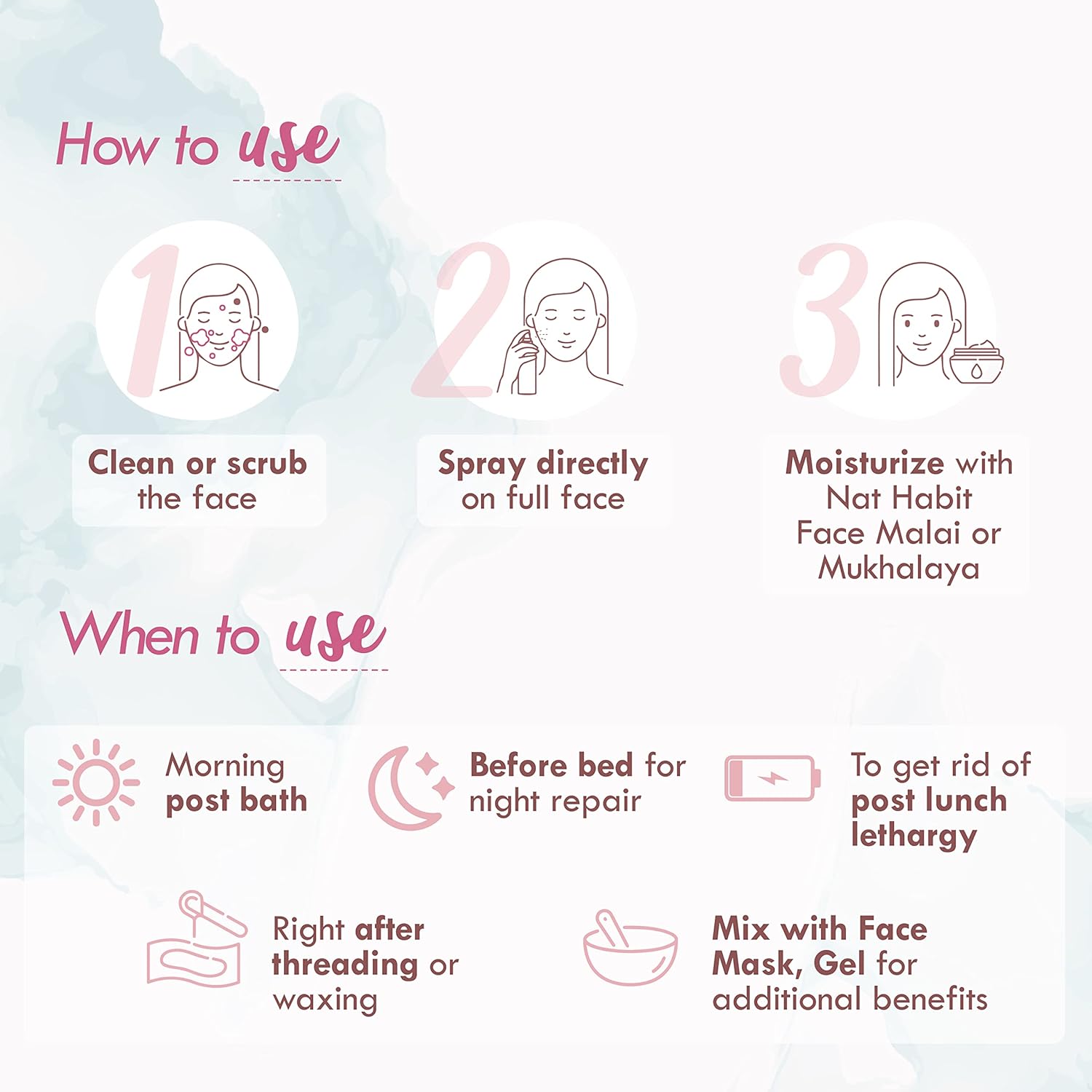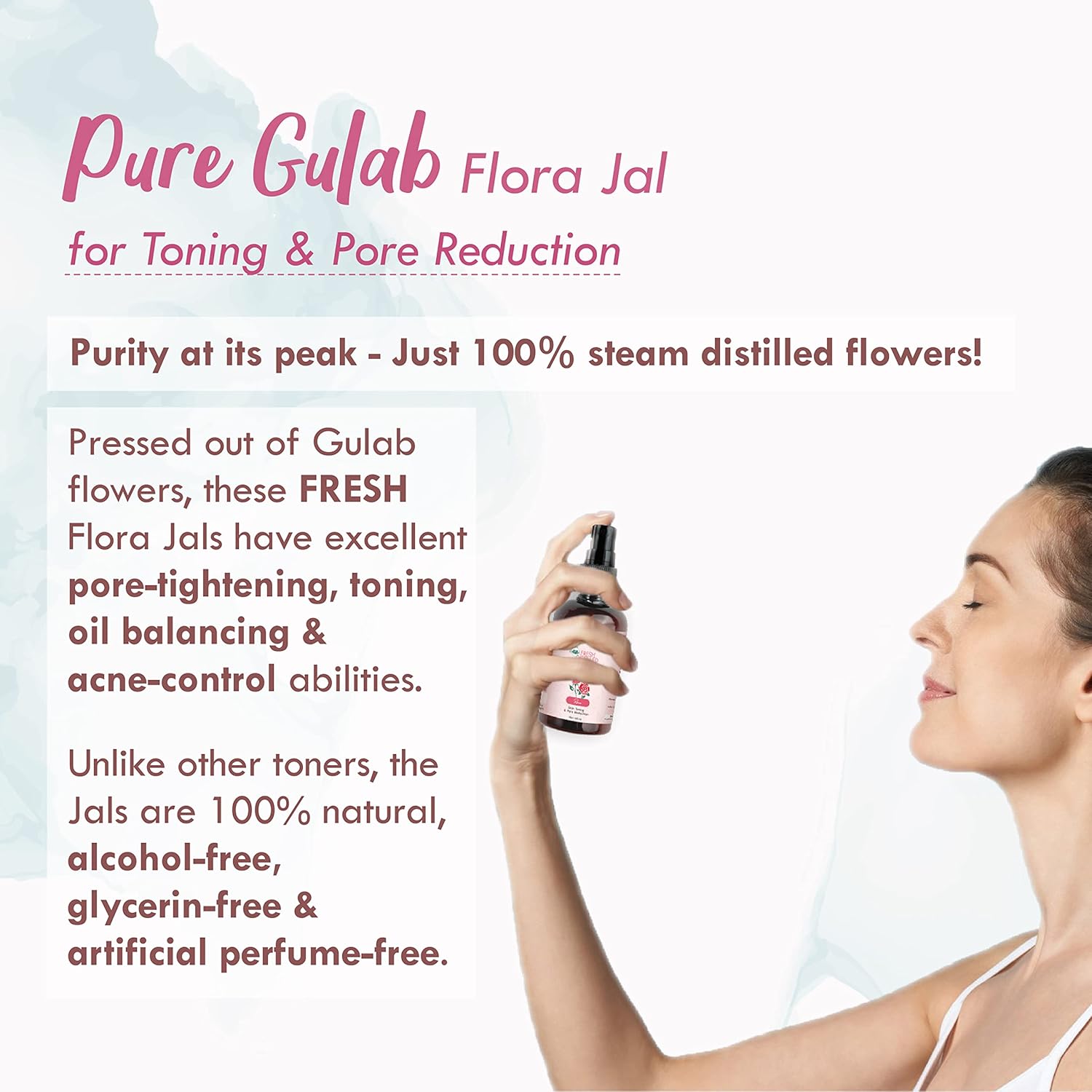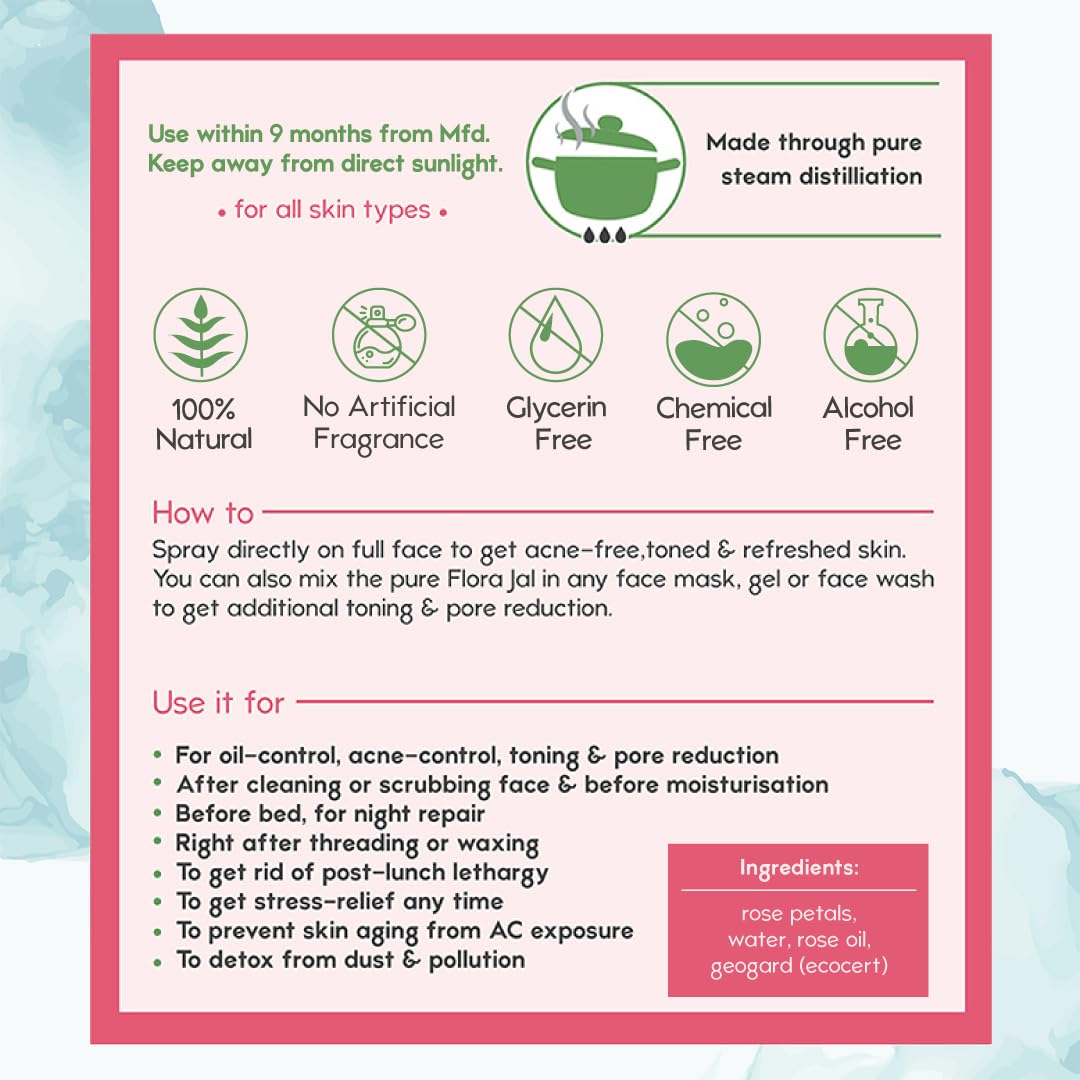 - How To Use : Spray Flora Jal directly on full-face to get acne-free, toned & refreshed skin. You can also mix the pure Flora Jal in any face mask, gel, or facewash to get additional toning & pore reduction.