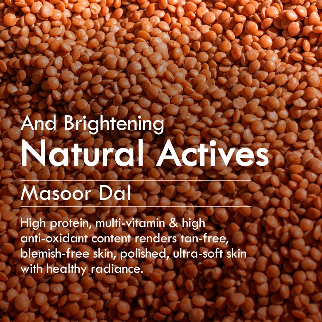 - Masoor Dal -Brightening Natural Active – High protein, multi-vitamin & high antioxidant content renders tan-free, blemish-free skin, polished, ultra-soft skin, with healthy radiance.