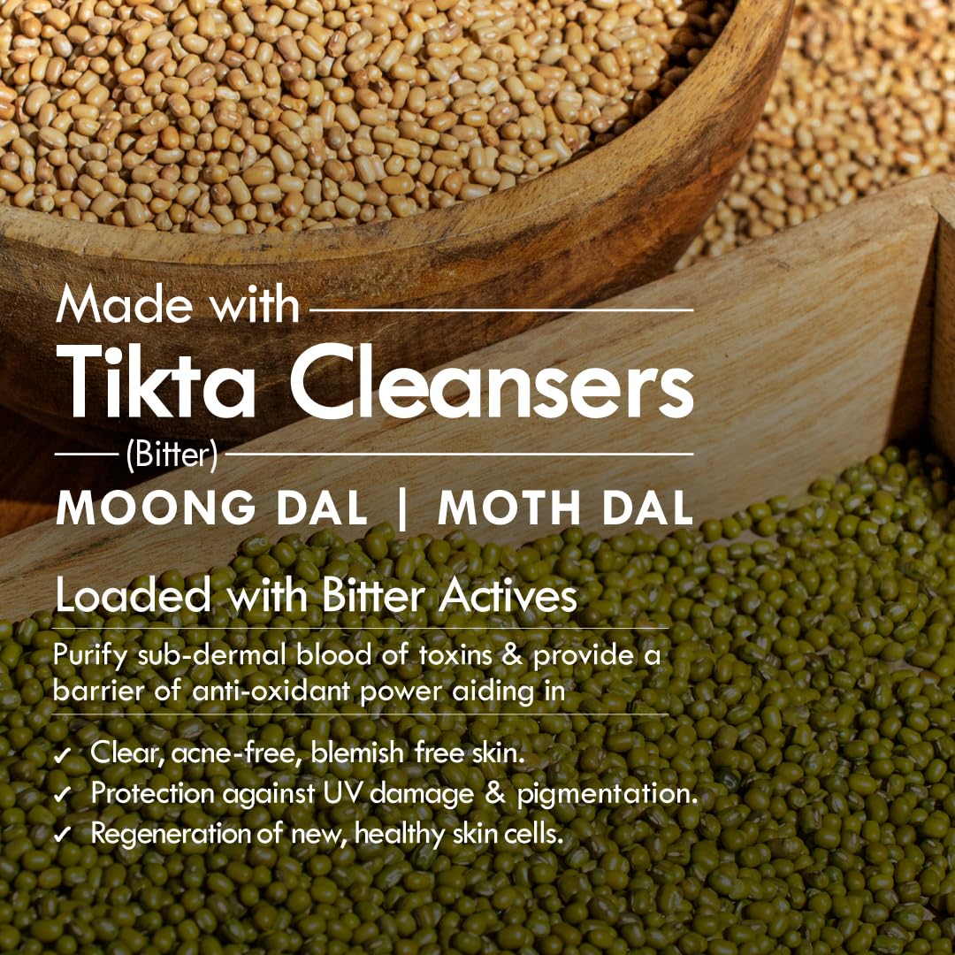 - Ingredients, Moong Dal, Moth Dal Loaded with bitter activities. Purify sub-dermal blood of toxins & provide a barrier of antioxidant power aiding in clear, acne-free, blemish free skin protection against UV damage & pigmentation, regeneration of new, healthy skin cells